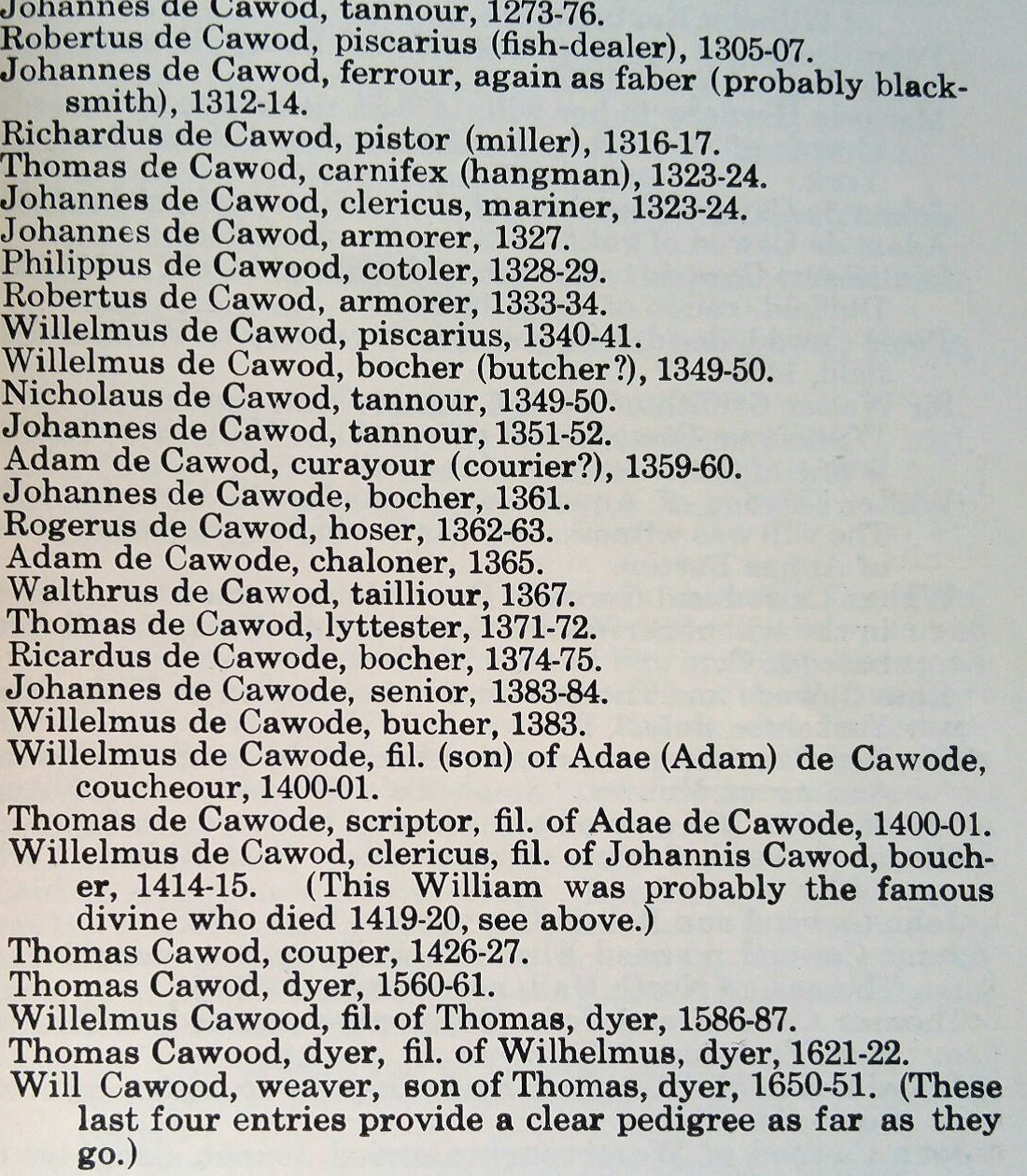 In Olde England most people had to name their occupation to own property and in census’ at the times between 1200 amd 1400 AD .Richardus De Cawood as a pistor or Miller while it seems Thomas De Cawood was listed as a Carnifex or a hangman, this one has left me wondering who he hanged and if it was anyone famous, I searched but found nothing,, and will always be a mystery, I suppose, lost in the fog of time. It has however given me an Idea for a story that I will write at a future time.