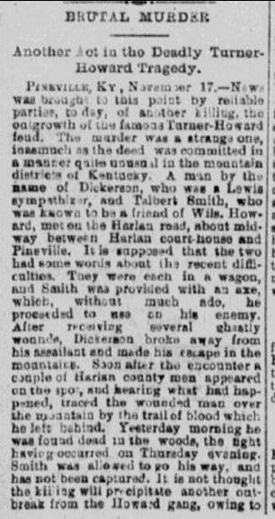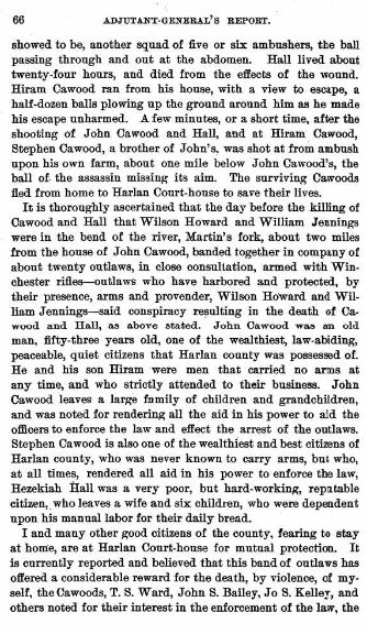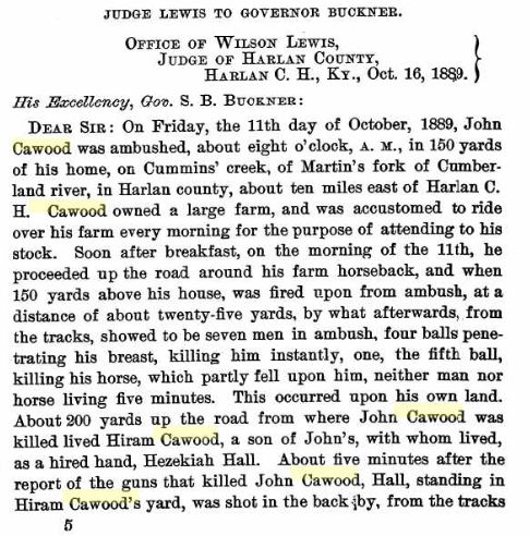 John Cawood’s son in law married to his daughter Nancy was John Crockett Carter who lived up the creek from John Cawood. John Cawood gave him a large piece of land for a Dowry which he had logged and bought more land with the money. During the Howard- Turner Feud John Cawood was ambushed and killed by the Howard faction, this same group tried to kill His brother Stephen at his home, a rifle ball barely missed him and lodged in a porch pillar by his head. Then they went after John’s son Hiram who barely escaped by running around the house with rifle balls kicking up dust round his feet, but they killed his hired man Hezekiah Hall. Later that night they waited outside of John Crocket Carters home to kill him when John’s little boy walked out onto the porch and remarked to his mother; ”I wish daddy would come home from Kansas City, I miss him terribly”, (John Crockett carter was away on business to Kansas City to buy or sell cattle,) so they left them alone. Later, the Carter Family of Lee County VA Heard of this and sent the Howards a letter stating that if a hair of John Crockett’s head was mussed they would get a posse of 25 men and come to Harlan County to avenge him. John Crockett Carter or his family was never bothered again.