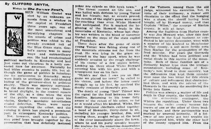 Governor Goebel’s Assassination linked to Howard Turner Fued On October 27, 2025October 27, 2025 By George A CawoodLeave a comment William Justus Goebel The Murder of Kentucky Governor William Goebel, 1900